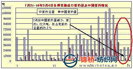 上周(2.26-3.4)美國凈簽約出口本年度陸地棉29914噸,較前周減1%,但較近四周平均值減50%;裝運73550噸,為年度來最高,較前周增12%,較近四周平均值增44%。凈簽約出口本年度皮馬棉3266噸,較前周增2%,較近四周平均值增27%;裝運1882噸,較前周增一倍,但較近四周平均值減34%。此外,凈簽約出口下年度陸地棉4332噸。 2月份來,受國際棉價飚漲及節(jié)假日影響,中國進口美棉簽約量一改11月份大幅增長為大幅減少。2月份中國僅簽約1.22萬噸,占美棉出口簽約總量的比重由前期的41.8%下降至2月份的29.2%。 |