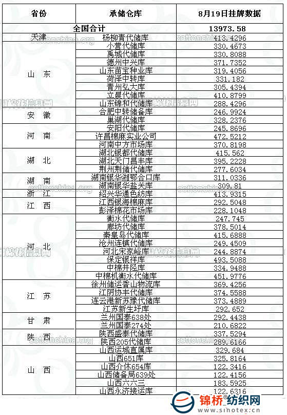 錦橋紡織網(wǎng)—資訊頻道> 棉花信息> 棉花動(dòng)態(tài)>正文 8月19日儲(chǔ)備棉投放預(yù)告:計(jì)劃投放13974噸