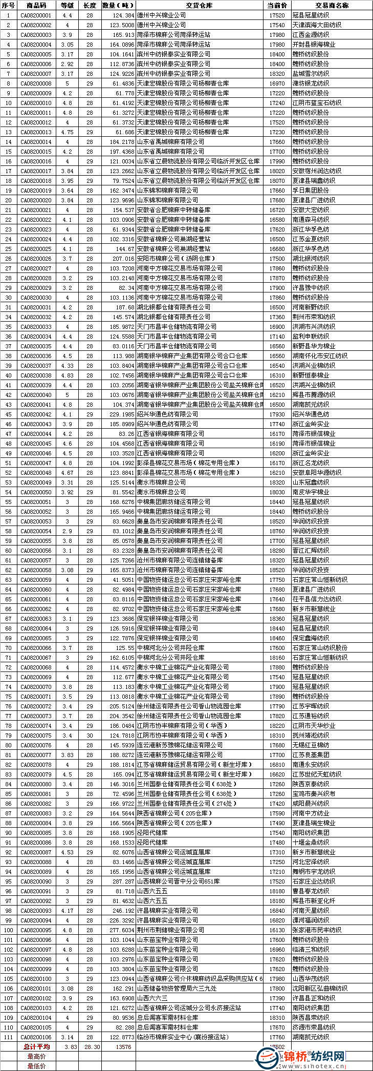 8月20日儲(chǔ)備棉投放數(shù)量為13576噸,歷時(shí)約5個(gè)小時(shí)全部成交。平均等級(jí)3.83,較上一日低0.08;平均長(zhǎng)度28.30,與上一日相比低0.04;加權(quán)成交價(jià)17502元/噸,較上一日高857元,折328級(jí)成交價(jià)為17885元/噸(凈重),較上一日高925元。 今日競(jìng)賣主要特點(diǎn):