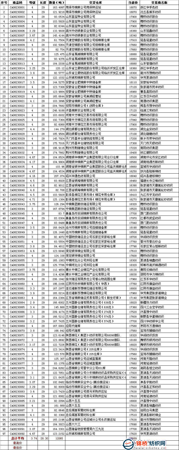 8月23日儲(chǔ)備棉投放數(shù)量為12065噸,較上一交易日減少1511噸,全部成交;平均等級(jí)3.75,較上一日高0.08;平均長(zhǎng)度28.30,與上一日持平;加權(quán)成交價(jià)17689元/噸,較上一日高187元,折328級(jí)成交價(jià)為18036元/噸,較上一日高151元。 競(jìng)拍主要特點(diǎn):