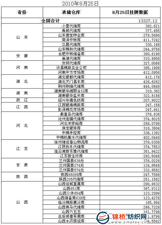 8月25日計劃投放儲備棉13327.12噸,以下為投放庫點具體數(shù)據(jù)情況: