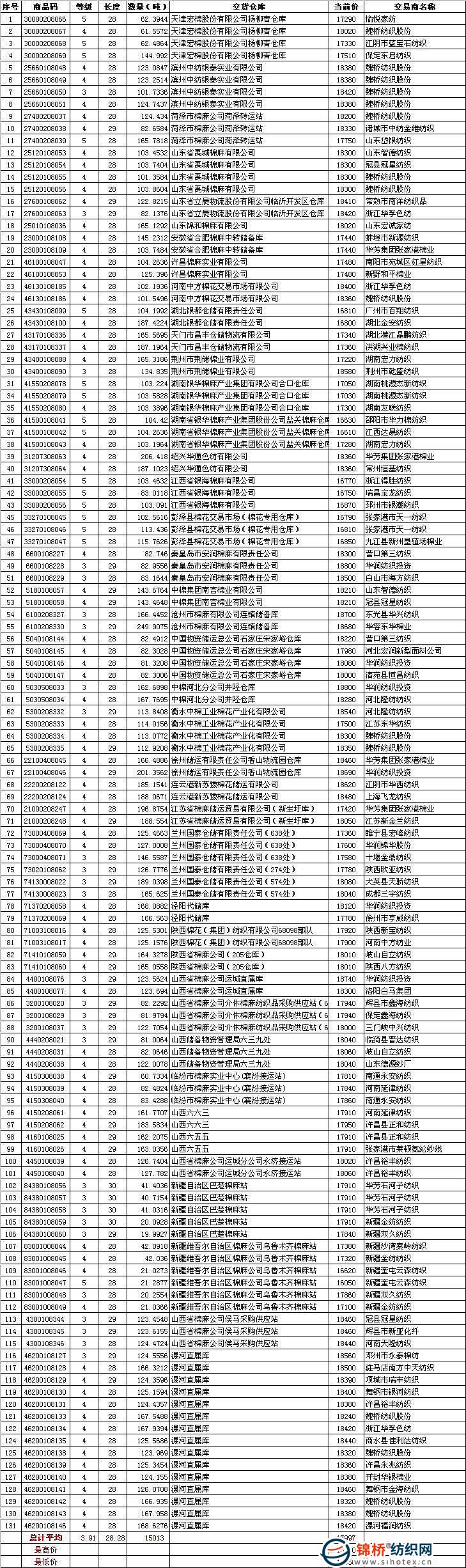 二是當(dāng)日最高成交價18800元/噸,平均品級329級,83噸,328級163噸,分另承儲在秦皇島市安潤棉麻有限責(zé)任公司和中棉河北分公司井陘倉庫,由華潤紡織投資發(fā)展有限公司競得;最低成交價16050元/噸,平均品級528級,共計21噸,承儲在新疆維吾爾自治區(qū)棉麻公司烏魯木齊棉麻站,由新疆奎屯云森紡織有限公司競得。 三是當(dāng)日參與投放的掛牌資源中,3級棉有2977噸,占比20%;4級棉有10438噸,占比70%;5級棉1598噸,占10%;當(dāng)日3級棉比例較上一日微降,4級棉比重占到七成。 四是當(dāng)日儲備棉投放新疆庫點推出331噸,較上一日少21噸,全部成交,由疆內(nèi)五家紡企竟得。平均等級3.51,平均長度28.93,加權(quán)均價為17507元/噸,折328價格17613元/噸。 五是參與競買的企業(yè)個數(shù)穩(wěn)定,成交企業(yè)增多,部分有實力的企業(yè)也逐步加入。當(dāng)日326家交易商參與競賣,有81家企業(yè)最終成交,成交平均比率24.85%。不包括魏橋,企業(yè)平均成交165噸,即平均每個企業(yè)占總成交量的比重為1.1%左右。魏橋紡織股份當(dāng)日成交1818噸,占成交總量的12.1%,平均等級3.94,較前一交易日低0.12,均價18318元/噸,折328級18840元/噸,分別比前交易日高168元和300元,兩個交易日分別提高413元和523元。