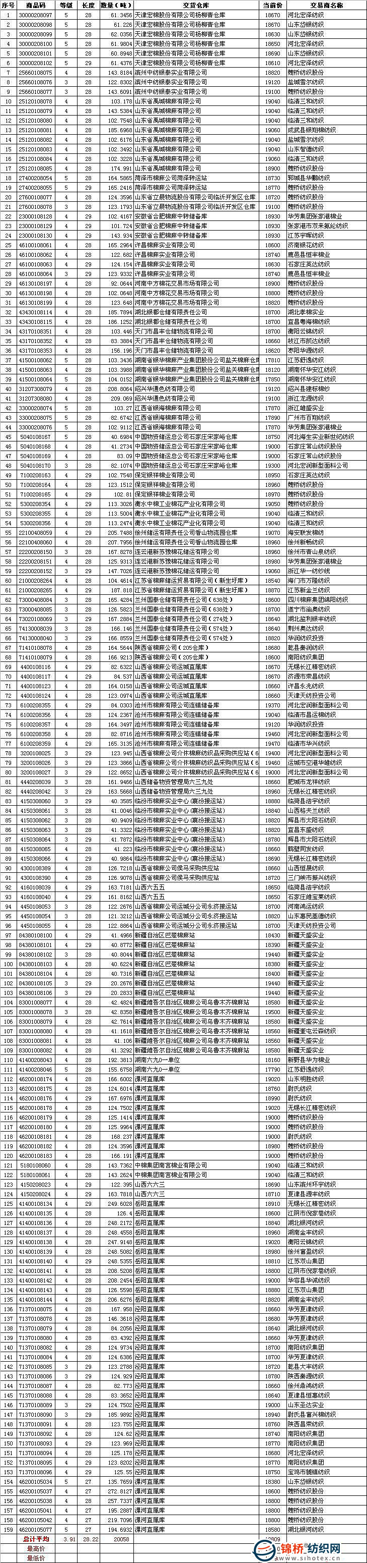 四是當(dāng)日最高成交價19500元/噸,平均品級328級,共計43噸,承儲在新疆維吾爾自治區(qū)棉麻公司烏魯木齊棉麻站,由新疆天盛實業(yè)有限公司競得;最低成交價17790元/噸,平均品級528級,共計156噸,承儲在湖南六九0一單位,由江蘇舒逸紡織有限公司競得。 9月9日儲備棉成交明細表 |