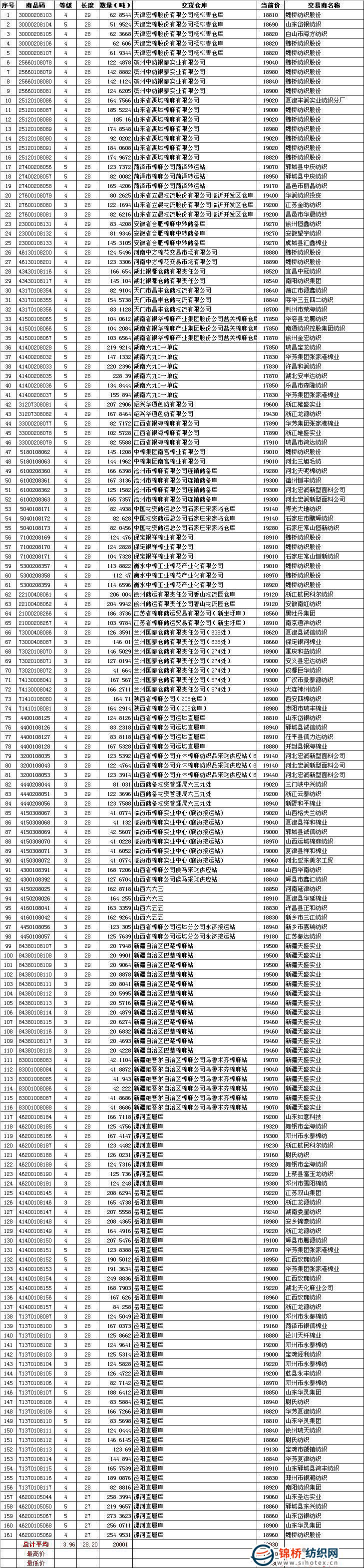 三、當(dāng)日最高成交價(jià)19600元/噸,平均品級(jí)428級(jí),共計(jì)207噸,承儲(chǔ)在紹興華通色紡有限公司,由浙江雄盛實(shí)業(yè)有限公司競(jìng)得;最低成交價(jià)17830元/噸,平均品級(jí)528級(jí),共計(jì)523噸,承儲(chǔ)在湖南六九0一單位,由華芳集團(tuán)張家港棉業(yè)有限公司和許昌和潤(rùn)紡織有限公司競(jìng)得。