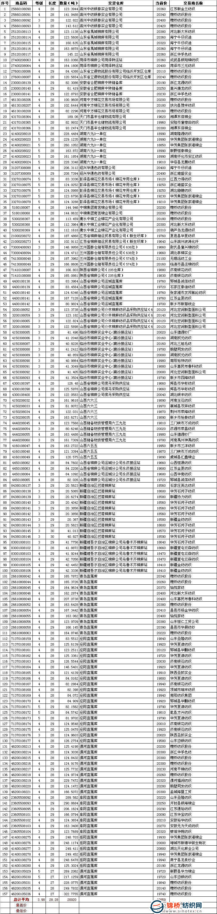 三是當(dāng)日最高成交價(jià)21100元/噸,平均品級(jí)329級(jí),共計(jì)187噸,承儲(chǔ)在蘭州國泰倉儲(chǔ)有限責(zé)任公司(574處),由遠(yuǎn)紡工業(yè)(無錫)有限公司競(jìng)得;最低成交價(jià)18410元/噸,平均品級(jí)429級(jí),共計(jì)85噸,承儲(chǔ)在新疆維吾爾自治區(qū)棉麻公司烏魯木齊棉麻站,由新疆金紡紡織股份有限公司競(jìng)得。