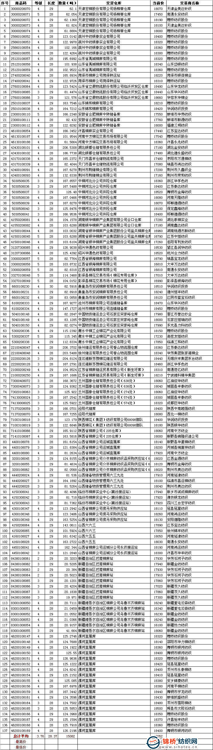 一是、當(dāng)日最高成交價(jià)18660元/噸(凈重),平均品級(jí)329級(jí),共計(jì)122噸,承儲(chǔ)在山東省立晨物流股份有限公司臨沂開(kāi)發(fā)區(qū)倉(cāng)庫(kù),由華容東華棉業(yè)有限責(zé)任公司競(jìng)得;最低成交價(jià)16100元/噸(凈重),平均品級(jí)428級(jí),共計(jì)21噸,承儲(chǔ)在新疆維吾爾自治區(qū)棉麻公司烏魯木齊棉麻站,由新疆協(xié)力紡織股份有限公司競(jìng)得。