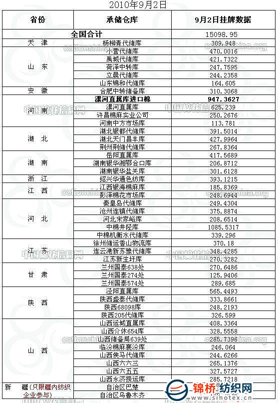 9月2日計劃投放儲備棉15098.95噸,以下為投放庫點具體數(shù)據(jù)情況: