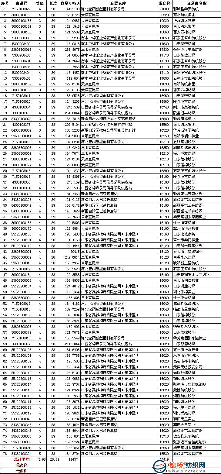 五是當(dāng)日最高成交價21000元/噸,平均品級428級,共計41噸,承儲在河北宏潤新型面料有限公司倉庫,由鄆城縣華天紡織有限公司競得;最低成交價15530元/噸,平均品級528級,共計165噸,承儲在新疆自治區(qū)巴楚棉麻站,由新疆奎屯云森紡織有限公司競得。