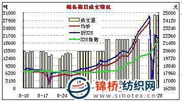 9月28日國家繼續(xù)增發(fā)40萬噸儲備棉,競賣交易連續(xù)進(jìn)行。當(dāng)日儲備棉投放數(shù)量30016噸,全部成交,其中有10414噸已公檢棉花,平均等級4.08,較昨日高0.03,平均長度28.82,較昨日高0.24;加權(quán)平均成交價21514元/噸,較昨日低262元,折328級成交價為22038元/噸,較昨日低336元。 當(dāng)日交易的主要特點:
