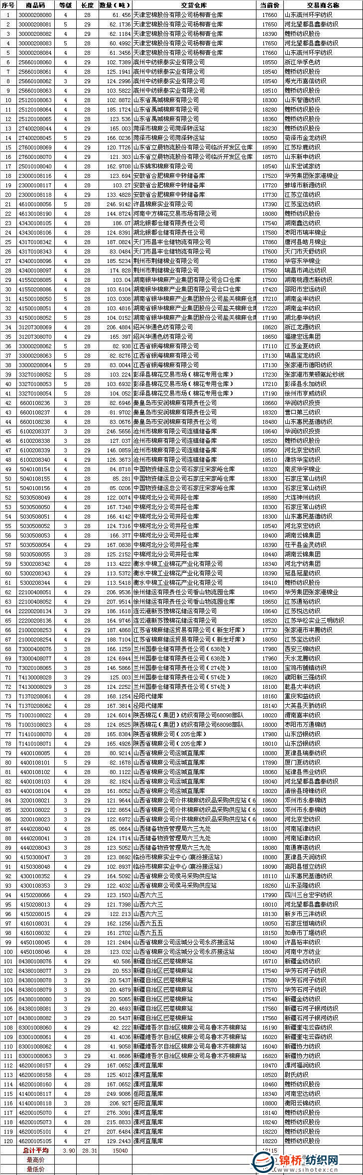 9月3日儲(chǔ)備棉投放數(shù)量為15040噸,全部成交;平均等級(jí)3.9,較上一日低0.1;平均長(zhǎng)度28.31,與上一日相比高0.05;加權(quán)成交價(jià)18115元/噸,較上一日漲55元,折328級(jí)成交價(jià)為18546元/噸,較上一日漲97元。298家交易商參與競(jìng)賣,有83家企業(yè)最終成交。 9月3日儲(chǔ)備棉成交明細(xì)表