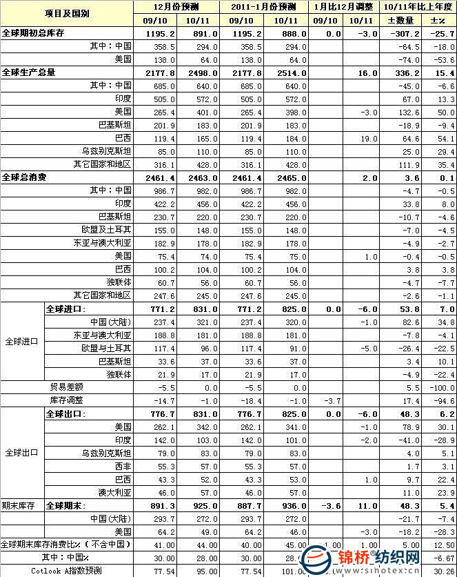 據(jù)據(jù)ICAC最新預(yù)測,2010/11年度全球棉花產(chǎn)量將同比增長15.4%至2514萬噸,供應(yīng)偏緊及較高的價格在一定程度上限制了消費,預(yù)計本年度全球消費量為2465萬噸,與上年度基本持平。 預(yù)計中國本年度棉花產(chǎn)量640萬噸,消費982萬噸,產(chǎn)需缺口達342萬噸,產(chǎn)需缺口率達34.8%。因此預(yù)計中國本年度將進口320萬噸,占全球棉花進口總量825萬噸的38.8%。但因全球第二大棉花出口國印度控制棉花出口,預(yù)計印度在其棉花產(chǎn)量增加67萬噸至572萬噸的情況下,出口卻較上年度減少41萬噸至101萬噸。而美國在本年度產(chǎn)量增加132.6萬噸至398萬噸的同時,棉花出口將增加78.9萬噸至341萬噸。因此中國棉花進口的主渠道仍將以美棉為主。根據(jù)預(yù)測,至2010年12月底,美國已凈簽約出口本年度棉花超過310萬噸,可供資源逐步趨緊,導(dǎo)致國際棉價持續(xù)上揚。ICAC最新預(yù)測本年度CotlookA指數(shù)平均值為101美分/磅,較上年度增長30%。 國際棉花咨詢委員會全球棉花產(chǎn)需預(yù)測(2011年1月)