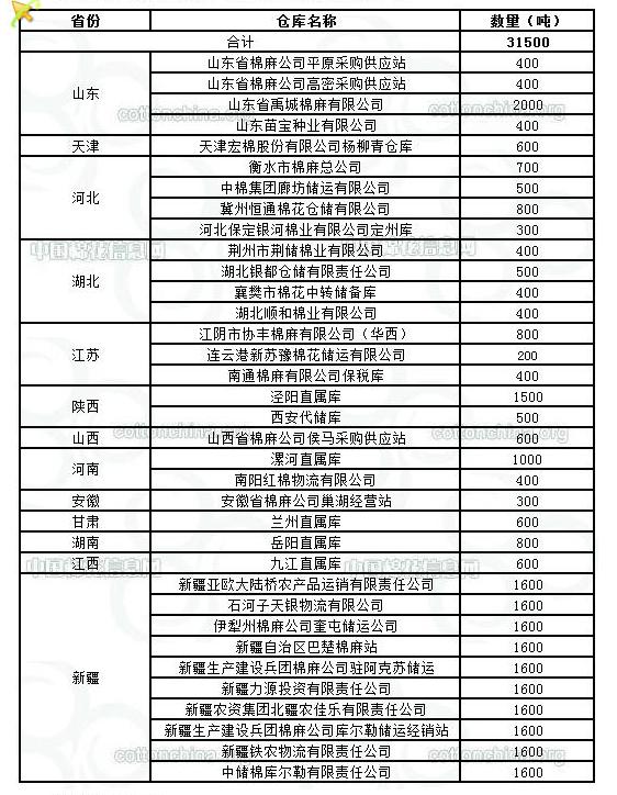 10月18日在以下指定倉庫收儲2011年度棉花31500噸。