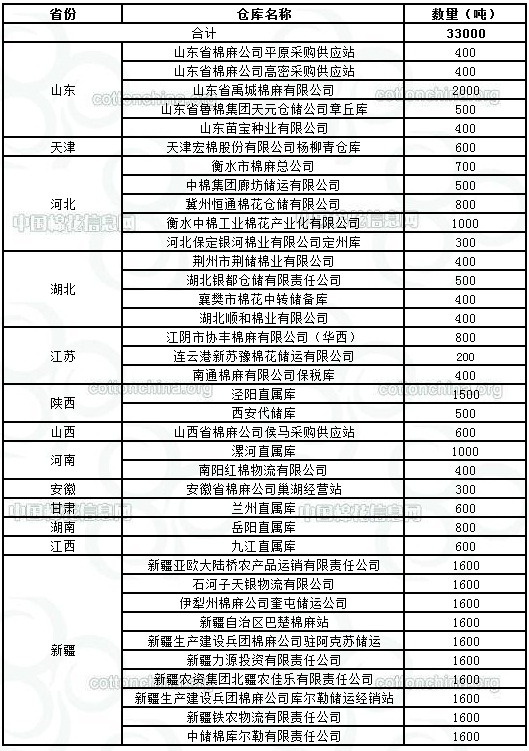 10月19日在以下指定倉庫收儲2011年度棉花33000噸。