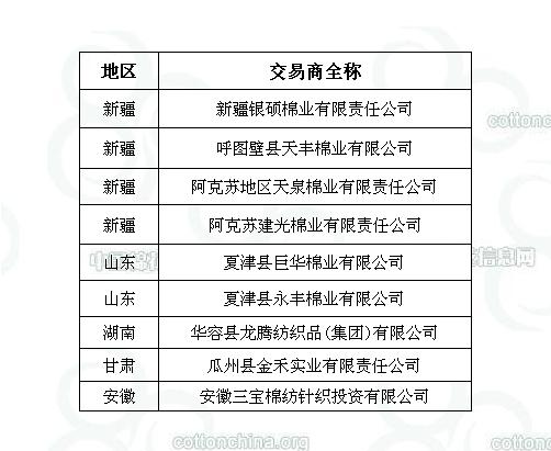 2011年度臨時收儲第三十批已審核交易商來自全國5個主產(chǎn)區(qū),共計9家。詳細名單如下: