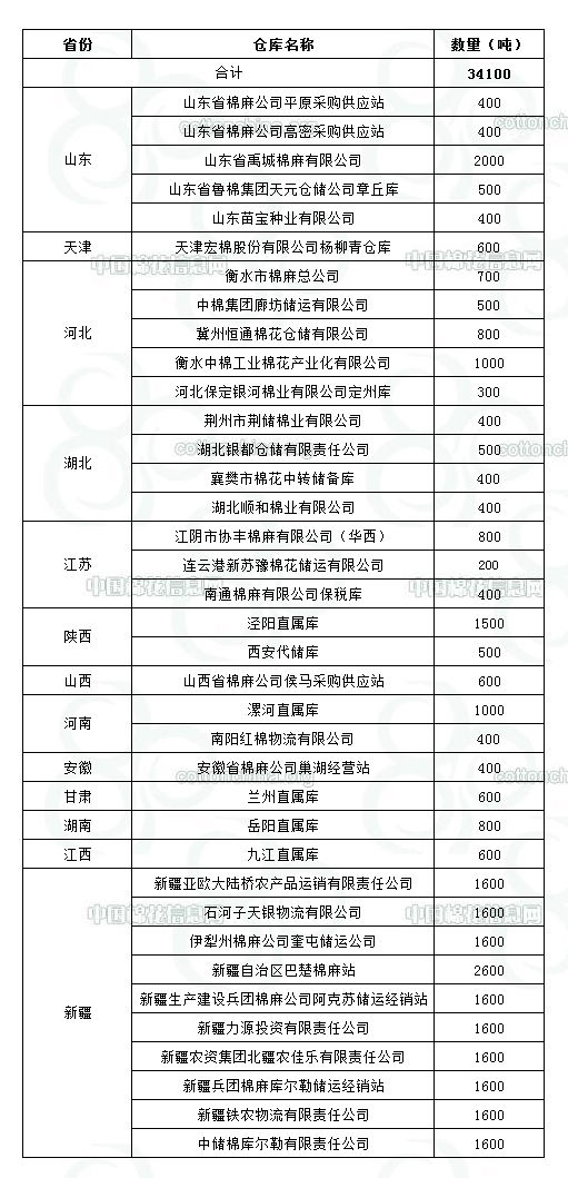 10月24日在以下指定倉(cāng)庫(kù)收儲(chǔ)2011年度棉花34100噸。