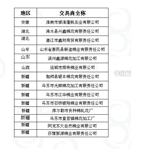 2011年度臨時(shí)收儲(chǔ)第三十四批已審核交易商來自全國5個(gè)主產(chǎn)區(qū),共計(jì)14家。詳細(xì)名單如下: