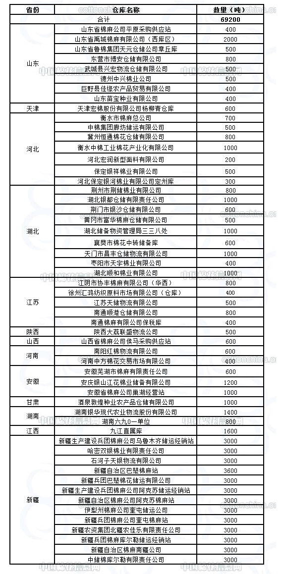 錦橋紡織網(wǎng)—資訊頻道> 棉花信息> 棉花動(dòng)態(tài)>正文 11月11日收儲(chǔ)庫(kù)點(diǎn)及數(shù)量