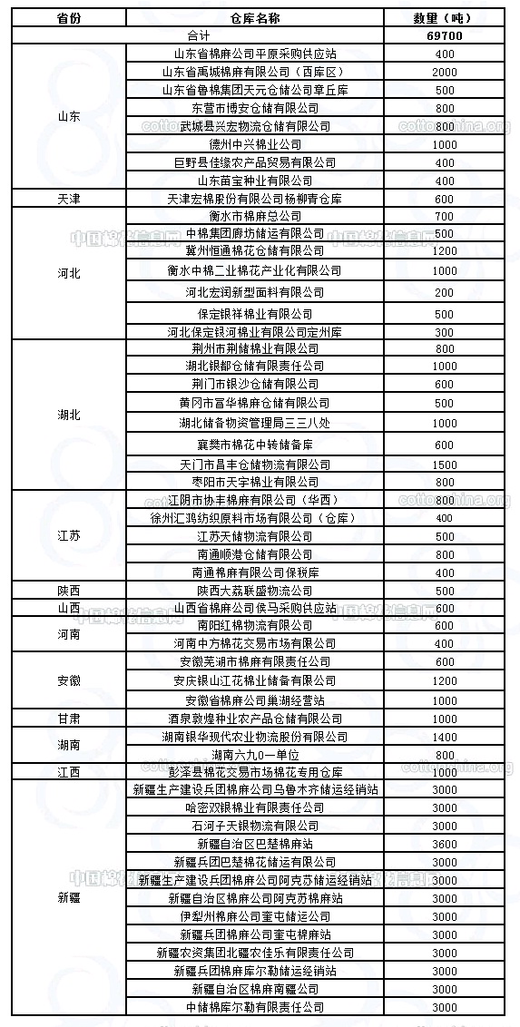 11月16日在以下指定倉庫收儲2011年度棉花69700噸