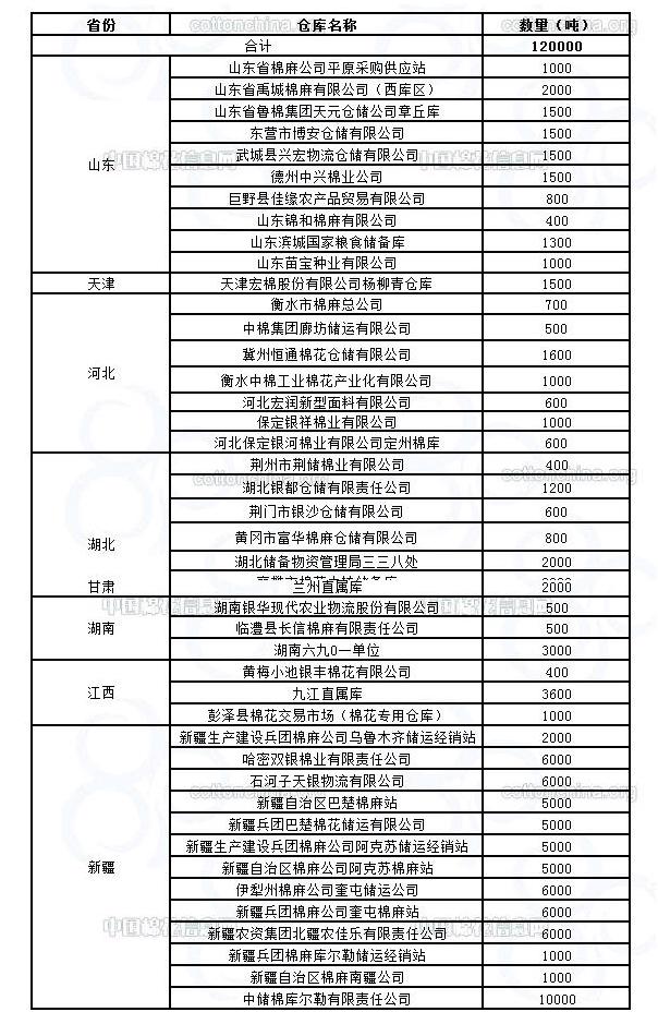 11月23日在以下指定倉庫收儲2011年度棉花120000噸