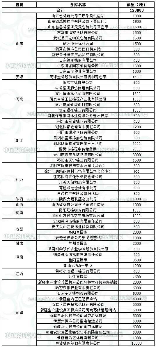 錦橋紡織網(wǎng)—資訊頻道> 棉花信息> 棉花動(dòng)態(tài)>正文 11月25日收儲(chǔ)庫(kù)點(diǎn)及數(shù)量