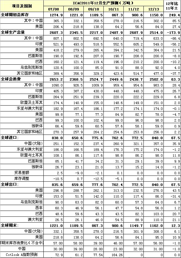國際棉花咨詢委員會12月份全球棉花產(chǎn)銷預(yù)測報告:與11月份預(yù)測報告比較,11/12年度的消費量和期末庫存量略做調(diào)整。即全球消費量調(diào)減21萬噸(其中中國調(diào)減4萬噸,印度調(diào)減14萬噸);全球年末庫存量調(diào)增21萬噸。報告對下年度(12/13年度)棉花產(chǎn)消情況作了預(yù)測。預(yù)測12/13年度全球棉花產(chǎn)量將有所下降,消費、進、出口都將有不同程度增長,期末庫存微增。