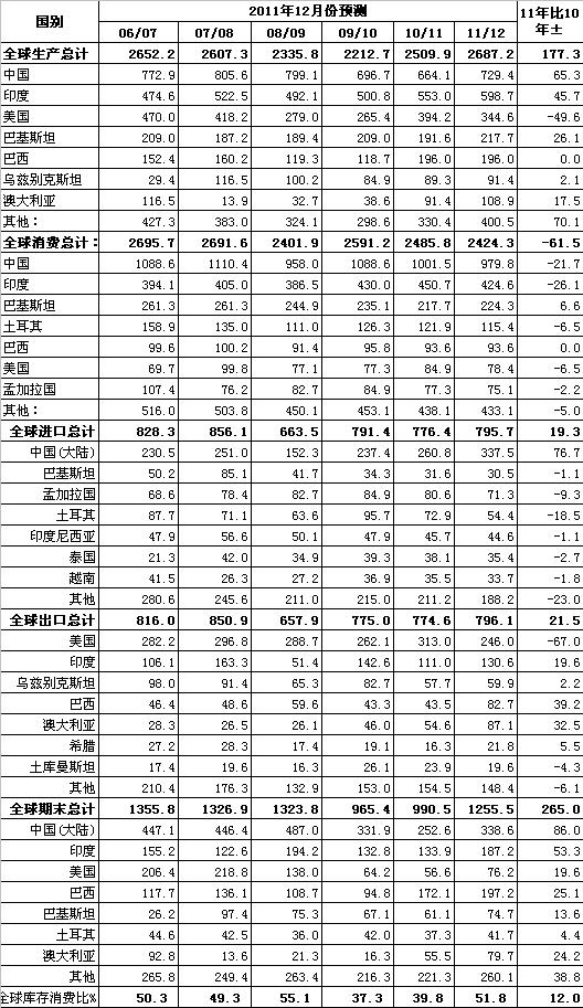 美國農(nóng)業(yè)12月預測,2011/12年度,全球棉花生產(chǎn)量,進、出口量及期末庫存量較上年度不同程度增加,消費下降。預測中國三增一減,即生產(chǎn)量、進口量、期末庫存量增加,消費較上年度減少。預測美國除期末庫存增加外,其他指標均全線下降。印度生產(chǎn)、出口、庫存增加,消費較大幅度下降。 2011/12年度,全球棉花生產(chǎn)2687萬噸(較11月份預測值調(diào)低10萬噸,主要是調(diào)減美國產(chǎn)量),創(chuàng)歷史新高,同比上年度增加177萬噸,增幅7.1%。其中中國729萬噸,增加65萬噸,增幅9.8%;印度增加46萬噸,增幅8.3%;巴基斯坦增加26萬噸,增幅13.6%;澳大利亞增加17.5萬噸,增幅19.2%。其他地區(qū)增加70萬噸,增幅21.2%。2011/12年度,全球消費2424萬噸(比11月份預測值調(diào)減63萬噸,其中中國和土耳其各調(diào)減10萬噸,印度調(diào)減21萬噸),同比上年度減少61萬噸,減幅2.5%。其中印度減少26萬噸,下降5.8%;中國減少22萬噸,下降2.2%;美國和土耳其增調(diào)減6.5萬噸,分別下降7.7%和5.3%;巴基斯坦增加6萬噸,增幅3%。 2011/12年度,全球棉花進口796萬噸(比11月份預測值調(diào)增5萬噸,其中中國調(diào)增32萬噸,土耳其調(diào)減13萬噸),同比上年度增加19萬噸,增幅2.5%。預測中國進口337萬噸,比上年度增加77萬噸,增幅29.4%,其他國家和地區(qū)均不同程度減少進口。2011/12年度,全球棉花出口796萬噸(比11月份調(diào)增5萬噸,其中印度調(diào)增16萬噸,澳大利亞調(diào)減4萬噸),同比上年度增加21萬噸,增幅2.8%。預測美國將減少出口67萬噸,下降24.4%;巴西、澳大利亞、印度分別增加39、33和20萬噸,分別比上年度增幅90.1%、59.5%和17.7%。 2011/12年度,由于全球棉花豐收,消費下降,期末庫存將大幅增加。預測本年度末全球期末庫量達1255萬噸(比11月預測值調(diào)增59萬噸,其中中國調(diào)增43萬噸,巴西和澳大利亞各調(diào)增4萬噸,印度和巴基斯坦各調(diào)增2萬噸),比上年度增加265萬噸,增幅26.8%。其中中國和印度將增加庫存86和53萬噸,同比增幅34.1%和39.8%;美國、巴西、澳大利亞等地區(qū)期末庫存量均比上年度有不同程度增加。