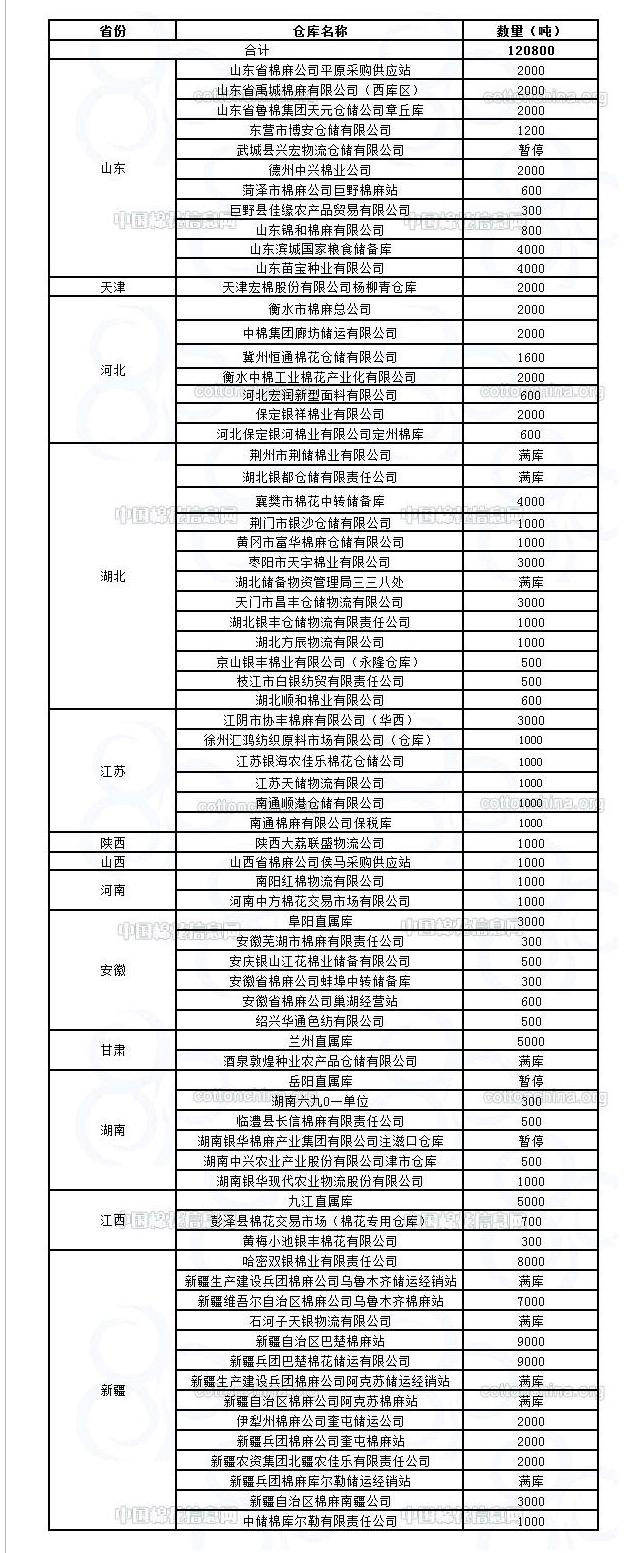 12月21日在以下指定倉庫收儲(chǔ)2011年度棉花120800噸。