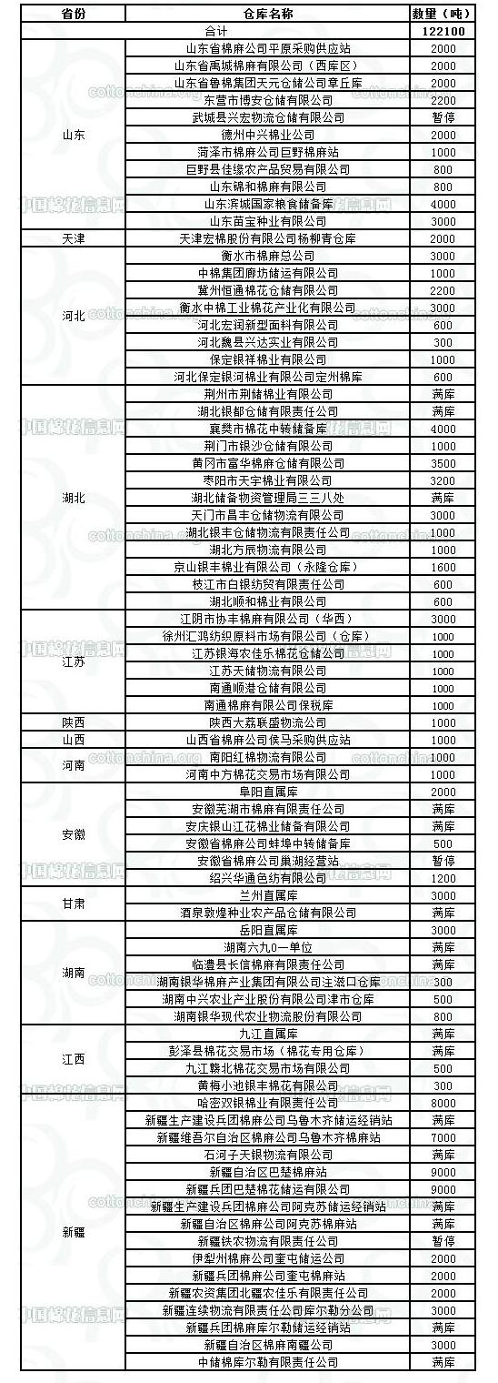 錦橋紡織網(wǎng)—資訊頻道> 棉花信息> 棉花動態(tài)>正文 12月27日收儲庫點(diǎn)及數(shù)量
