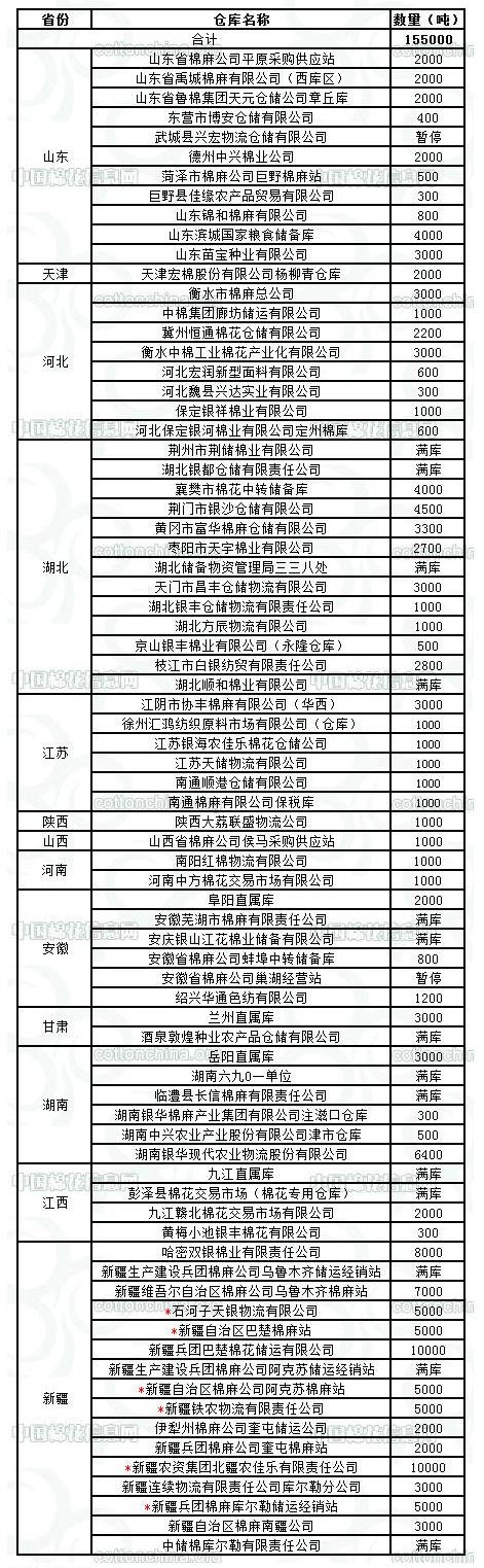 12月29日在以下指定倉(cāng)庫(kù)收儲(chǔ)2011年度棉花155000噸。為了騰空庫(kù)容,解決兵團(tuán)企業(yè)交儲(chǔ)困難的問(wèn)題,經(jīng)商國(guó)家有關(guān)部門(mén)同意,將新疆部分庫(kù)點(diǎn)的單筆合同由400噸調(diào)整為5000噸(具體見(jiàn)帶*庫(kù)點(diǎn))。