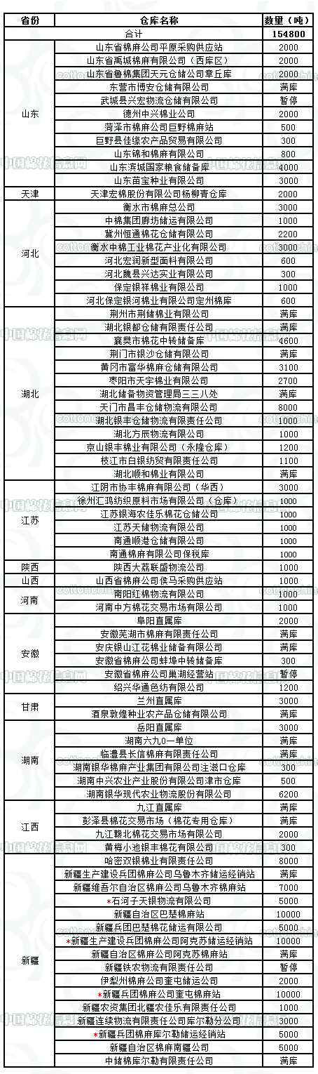 12月30日在以下指定倉庫收儲2011年度棉花154800噸。為了騰空庫容,解決兵團(tuán)企業(yè)交儲困難的問題,經(jīng)商國家有關(guān)部門同意,將新疆部分庫點的單筆合同由400噸調(diào)整為5000噸(具體見帶*庫點)。