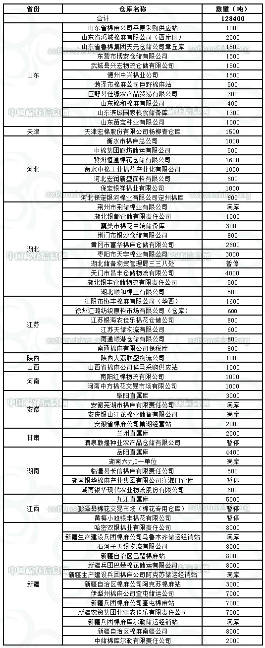 12月6日在以下指定倉(cāng)庫(kù)收儲(chǔ)2011年度棉花128400噸,個(gè)別庫(kù)點(diǎn)因滿庫(kù)暫停收儲(chǔ)。