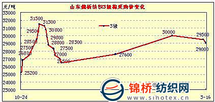 3月14、16日,山東濱州某大型紡織企業(yè)連續(xù)調(diào)降棉花采購(gòu)價(jià),2日共調(diào)降1000元/噸。目前3級(jí)棉采購(gòu)價(jià)29000元/噸,429級(jí)28700元/噸,427級(jí)28300元/噸。