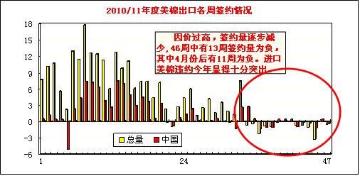 簽約下年度陸地棉的國家有危地馬拉(907噸)、秘魯(862噸)、中國(499噸)、韓國(476噸)、印度(181噸),凈簽約為負(fù)的有土耳其(-7688噸)、巴基斯坦(-1157噸)、摩洛哥(-794噸)、墨西哥(-454噸)、印尼(-340噸)。
