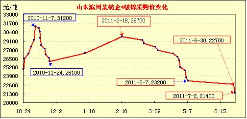 據(jù)悉,7月2日山東濱州某大型紡企再次大幅下調(diào)四級(jí)皮棉采購(gòu)價(jià),調(diào)整后21400元/噸,較之前下調(diào)1300元/噸,三級(jí)棉不變,依舊23500元/噸,此次下調(diào)距離上次調(diào)整僅2天時(shí)間4級(jí)棉共下調(diào)1800元。