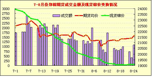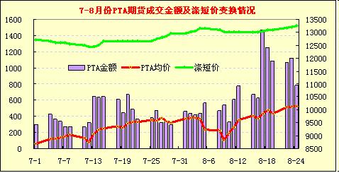 8月份部分資金在棉花期貨和PTA期貨之間切換。在前段時(shí)期棉價(jià)低迷不振的情況下,資金大量流向PTA期貨,日均成交額400-500億元的PTA期貨,從8月17日開始增至千億元以上,導(dǎo)致這段時(shí)期PTA期價(jià)反彈,成交均價(jià)由9500元/噸左右上漲至千元以上。此間,滌綸短纖出走出不錯(cuò)行情,由每噸13000元漲至13250元。