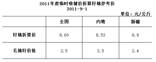 2011年度臨時(shí)收儲(chǔ)價(jià)折算籽棉參考價(jià)(2011年9月1日)