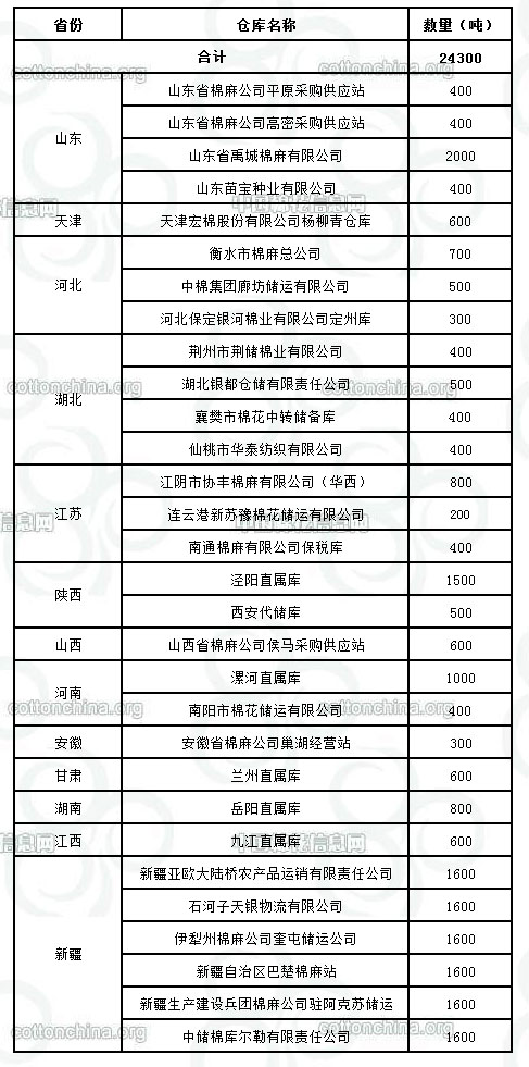 9月22日在以下指定倉庫收儲2011年度棉花24300噸。