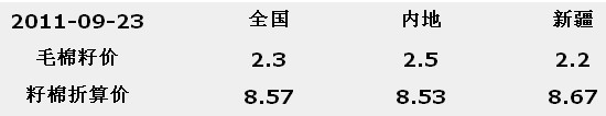 2011年度臨時收儲價折算籽棉參考價(2011年9月23日)