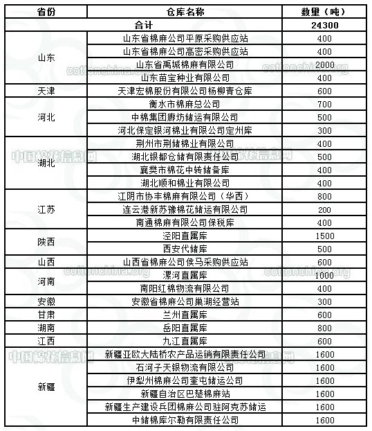 錦橋紡織網(wǎng)—資訊頻道> 棉花信息> 棉花動(dòng)態(tài)>正文 9月26日收儲(chǔ)庫點(diǎn)及數(shù)量