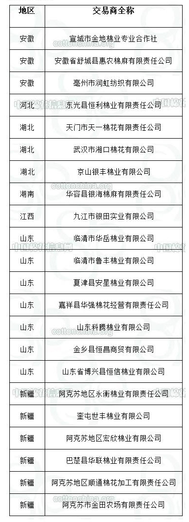 錦橋紡織網(wǎng)—資訊頻道> 棉花信息> 棉花動(dòng)態(tài)>正文 2011年度臨時(shí)收儲(chǔ)已審核交易商名單(第二十批)