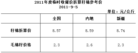 2011年度臨時收儲價折算籽棉參考價(2011年9月5日)