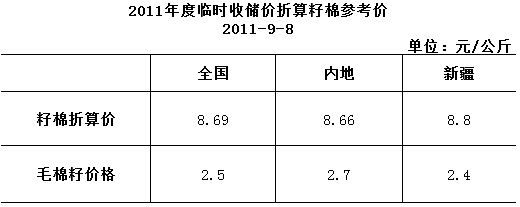 2011年度臨時(shí)收儲(chǔ)價(jià)折算籽棉參考價(jià)(2011年9月8日)