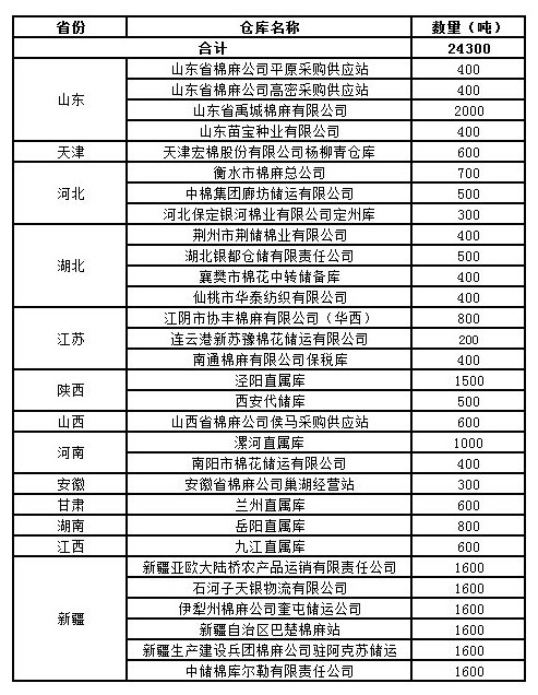 9月8日在以下指定倉庫收儲2011年度棉花24300噸。