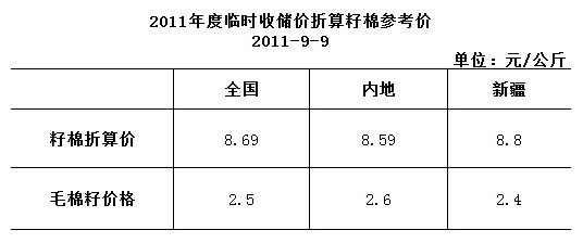 2011年度臨時(shí)收儲(chǔ)價(jià)折算籽棉參考價(jià)(2011年9月9日)