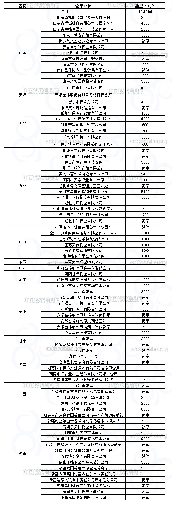 1月12日在以下指定倉庫收儲2011年度棉花123000噸。