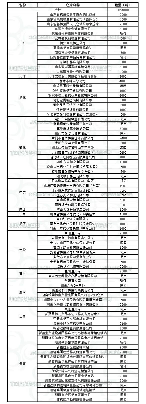 1月13日在以下指定倉庫收儲2011年度棉花123500噸。