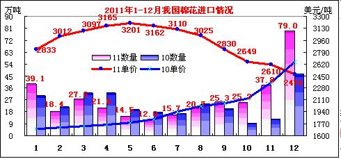 2011年12月份我國進口棉花數量大幅增長,平均價格較大幅度下跌。據海關統(tǒng)計,2011年12月我國進口棉花79萬噸,創(chuàng)單月進口最高歷史紀錄,較11月份增長109%,較去年同期增長71.2%;平均進口價格2476美元/噸,較11月下跌134美元,跌幅5.1%,同比下跌6.8%. 2011年全年我國累計進口棉花336.5萬噸,較去年同期增長18.5%。