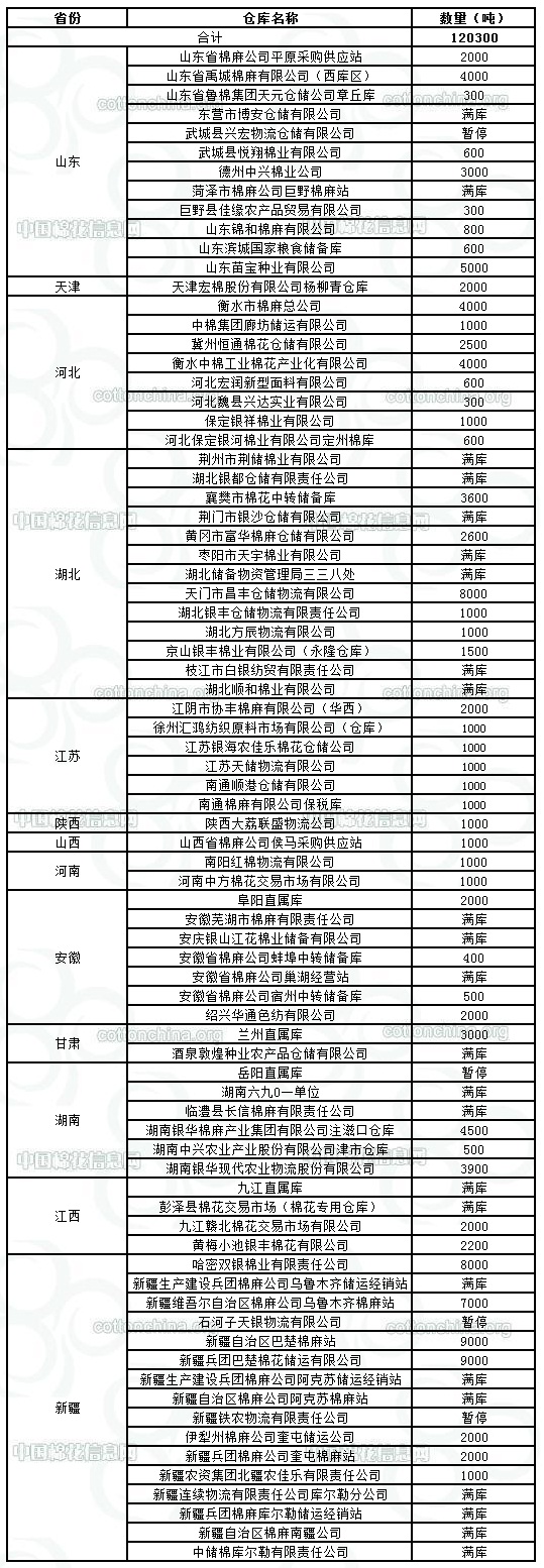 1月9日在以下指定倉(cāng)庫(kù)收儲(chǔ)2011年度棉花120300噸。