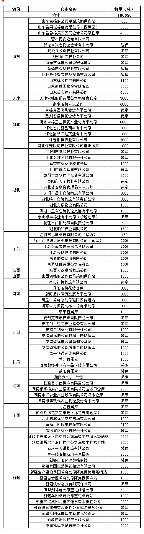 2月24日在以下指定倉庫收儲2011年度棉花100650噸。