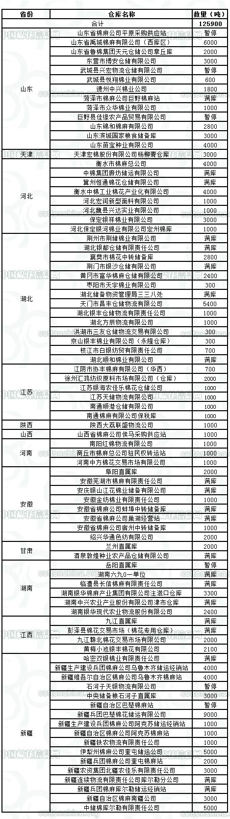 2月7日是春節(jié)后第一個收儲日,擬在以下指定倉庫收儲2011年度棉花125900噸。